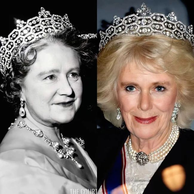 A belíssima Tiara Greville, que pertencia à rainha-mãe, Elizabeth Bowes-Lyon. Adquirida de Lady Greville, a Tiara fazia parte da coleção particular da esposa do rei George VI e permaneceu entre as suas posses até o dia de sua morte. A rainha-mãe costumava utilizar a joia em eventos da Coroa e em seus retratos oficiais. Antes de falecer, Elizabeth Bowes-Lyon legou em testamento esta, entre outras de sua joias, para o príncipe Charles. Atualmente, a Tiara é usada pela segunda esposa do herdeiro do trono, Camilla Mountbatten-Windsor, duquesa de Cornwall. Em 5 de fevereiro de 2022 (um dia antes de completar 70 anos de reinado), a rainha Elizabeth II direcionou uma carta à comunidade de Nações Britânicas, afirmando: “é meu desejo sincero que, quando o tempo chegar, Camilla seja reconhecida como Rainha Consorte, enquanto ela dá continuidade ao seu leal serviço”.