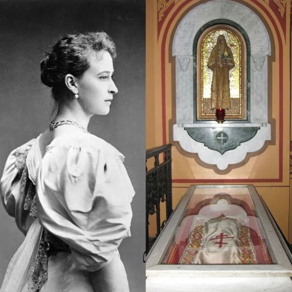 Fotografia de Elizabeth Feodorovna tirada em 1894 e o corpo da grã-duquesa, amortalhado dentro de seu esquife na Igreja de Santa Maria Madalena, em Jerusalém.
