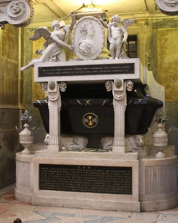 Túmulo da rainha Dona Maria I de Portugal, localizado na Basílica da Estrela, em Lisboa. A soberana faleceu aos 81 anos na cidade do Rio de Janeiro, em 20 de março de 1816. O corpo, originalmente sepultado no Convento da Ajuda, foi trazido de volta para Portugal quando a família real regressou para a metrópole, em 1821.