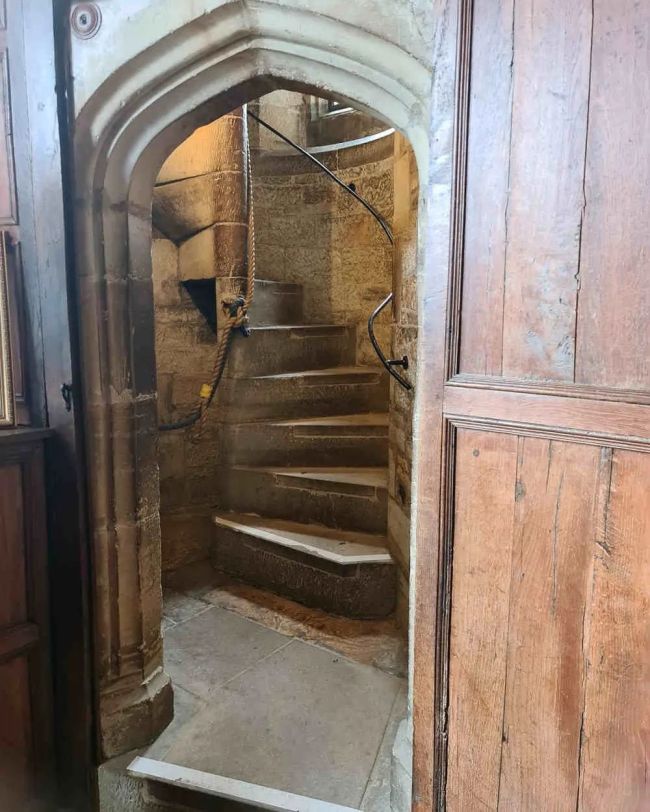 Porta de carvalho que dá acesso a uma escada em espiral, no quarto de Ana Bolena.