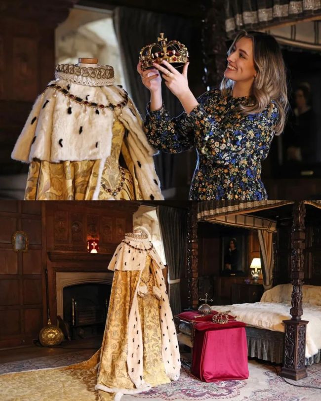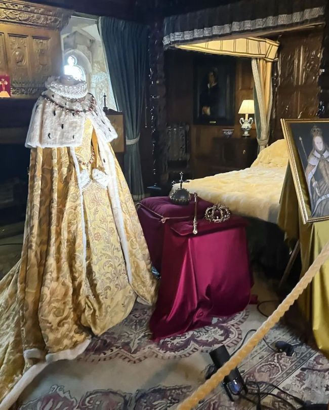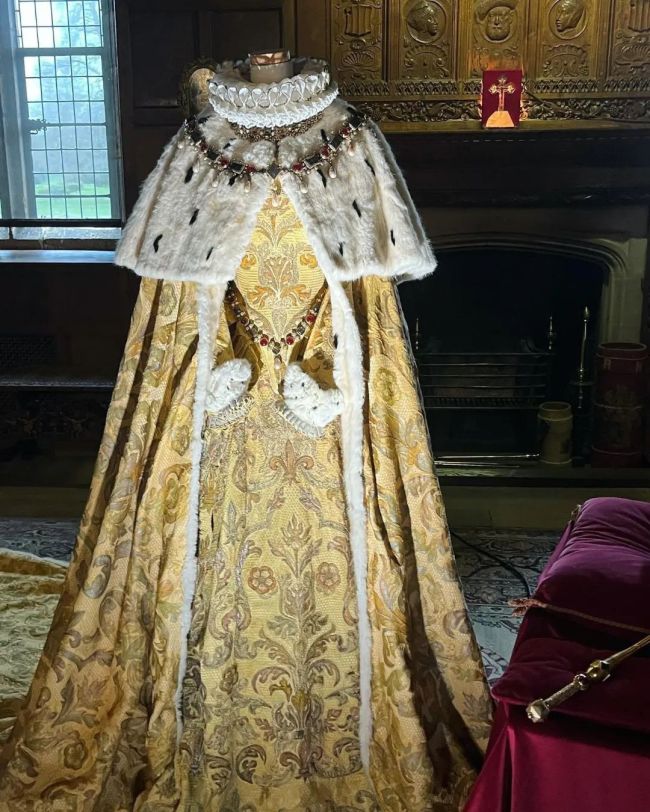 Recentemente, o castelo de Hever foi lar de uma exposição que abrigou a belíssima réplica do vestido da coroação da rainha Elizabeth I, usado pela atriz Cate Blanchett no filme “Elizabeth” (1998). Numa das imagens, podemos ver a curadora assistente, Kate McCaffrey,no quarto do rei, próxima ao vestido de coroação. Ao lado dos trajes, vemos sobre uma almofada as outras peças da regalia real, como a coroa, o orbe e o cetro usados pela atriz na cena da coroação. O trajes foram feitos com base em um retrato da rainha Elizabeth I recém-coroada em 1559, pintado no final do século XVI a partir de um original (hoje perdido). Como podemos ver, Cate usou uma recriação perfeita dos trajes da monarca na cena. O vestido em amarelo ouro foi bordado com o mesmo padrão floral do manto. A soberana também estava ricamente coberta com joias adornadas com pérolas naturais em formato de gota, rubis e topázios. Seus cabelos ruivos caíam delicadamente atrás do manto, enquanto a coroa lhe adornava a fronte. Com uma das mãos ela segurava um orbe, que representava seus domínios sobre a Inglaterra, a Irlanda e Gales, enquanto com a outra mão ela segura o cetro real, símbolo de seu poder e direto de governar.