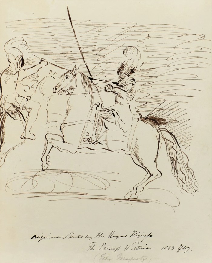 Este desenho de um cavaleiro montado, feito a bico de pena, está assinado como “esboço original por Sua Alteza Real, a Princesa Vitória. (Sua Majestade). 1833”.