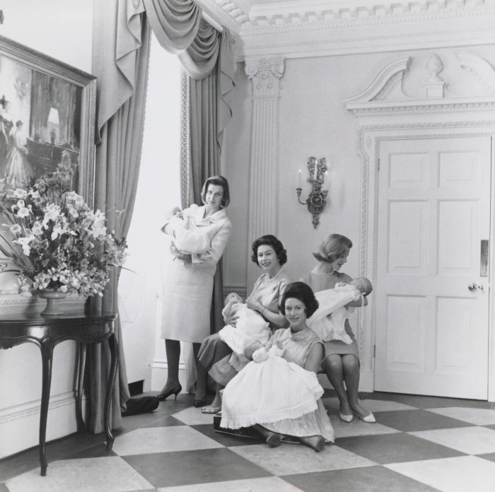 Uma das imagens inéditas da exposição consiste numa fotografia feita por Lord Snowdon, em 1964. O registro, nunca divulgado antes, apresenta a rainha Elizabeth II, a princesa Margaret, Katherine, duquesa de Kent, e a princesa Alexandra de Kent segurando seus bebês recém-nascidos.