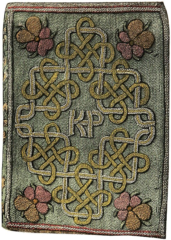 Bordado que a princesa Elizabeth fez para a capa de sua tradução de O espelho da alma pecadora, destinada à rainha Catarina Parr.