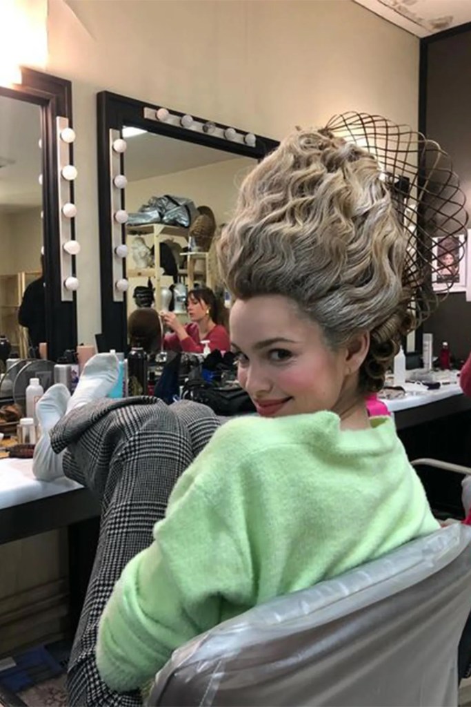 Bastidores da gravação da primeira temporada, com Emilia Schüle preparando seu cabelo para viver Maria Antonieta nas telas.