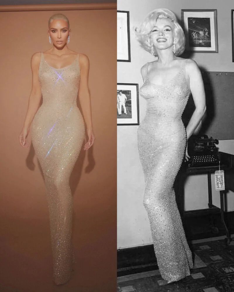 Em várias páginas sobre Moda, já se disse que a roupa foi costurada especialmente para a diva holywoodiana, combinando com seu tom de pele. Ela a usou para cantar “Parabéns pra você” ao presidente J.F. Kennedy, em 1962. Poucos meses depois, a atriz morreu por abuso de medicação. Sendo assim, o vestido, coberto de brilhantes, fez parte de uma das últimas grandes aparições públicas de Marilyn, estando intimamente ligado à construção de sua memória e imagem póstuma. A peça (adquirida num leilão em 2016 pelo Ripley’s Believe It or Not! Museum, localizado em Orlando, por 4,6 milhões de dólares), foi emprestada para a empresa de Kardashian de forma bastante irresponsável. Ao fazê-lo, Kim conseguiu dar o golpe publicitário que tanto buscava. Afinal, o vestido foi criado para se adequar à identidade de Monroe, não da socialite.