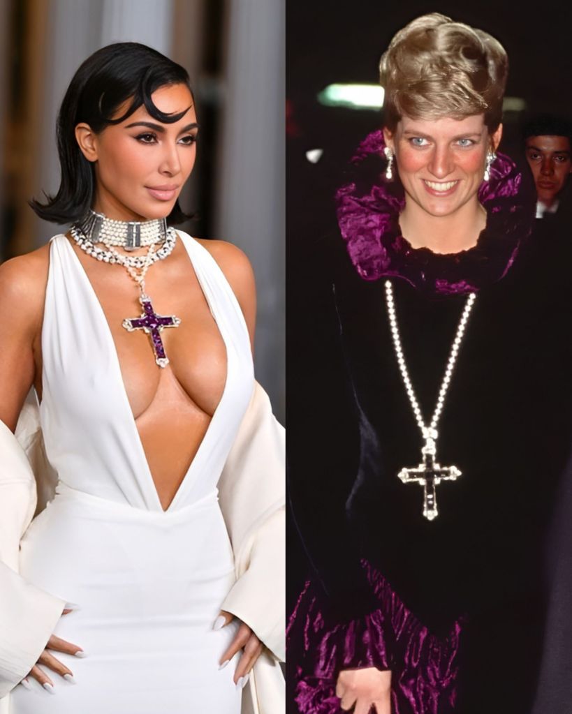 Kim Kardashian usando o mesmo crucifixo que Diana usou em 1987.