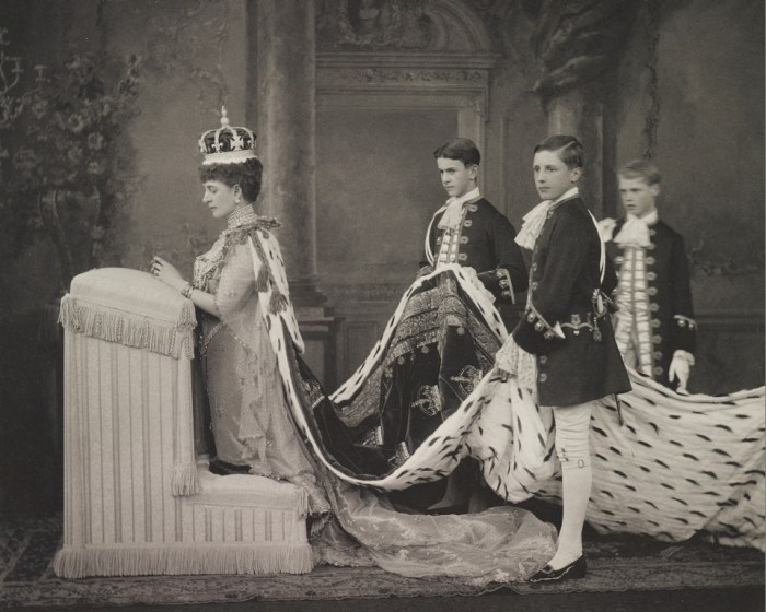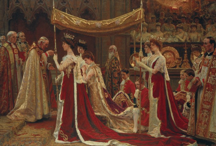Contudo, quando Alexandra penetrou a nave da abadia naquele dia 09 de agosto de 1902, toda a sua figura reluzia sob a luz elétrica. Tinha então 57 anos, mas ainda mantinha o talhe de sílfide e o porte gracioso da juventude. Um longo manto de veludo carmesim forrado com pele de arminho envolvia seus ombros. O colo, por sua vez, estava coberto de joias cravejadas com diamantes e pérolas (algumas de valor histórico, que haviam pertencido a Mary Stuart), evocando a imagem de uma rainha-imperatriz no seu auge. A rainha havia apontado o artista dinamarquês Laurits Tuxen como “pintor especial da coroação”, para retratar o momento solene em que a nova rainha se ajoelhava para o momento da unção. Segundo a curadora da exposição, Kathryn Jones: