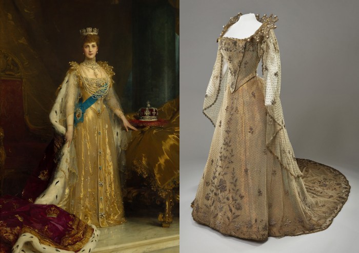 Mas, enquanto o traje da coroação da rainha Maud se encontra muito bem preservado no Museu Nacional da Noruega, mantendo suas cores vibrantes com seus diamantes artificiais, pérolas de cera e lantejoulas metalizadas quase intactos, o mesmo não pode ser dito do vestido da rainha Alexandra. Os conservadores levaram mais de 100 horas para preparar a peça para seu papel central na nova exposição, reconstituindo os bordados com fios metálicos. Segundo Kathryn Jones, o traje pode ser considerado como “um exemplo poderoso das tentativas de Edward e Alexandra de equilibrar tradição e modernidade enquanto estavam no início do século XX; um momento brilhante de glamour antes do mundo entrar em guerra”. Esplendor esse que pode ser comprovado pelas imagens da rainha, manipuladas por artistas e fotógrafos, preocupados em apresentá-la sob um prisma jovial, a despeito de seus quase 60 anos. Assim, Alexandra passou para a posteridade como uma rainha de beleza etérea, cuja era de elegância chegara ao fim quando as primeiras bombas da guerras explodiram em território sério, em 1914.