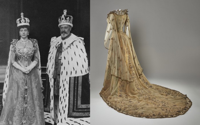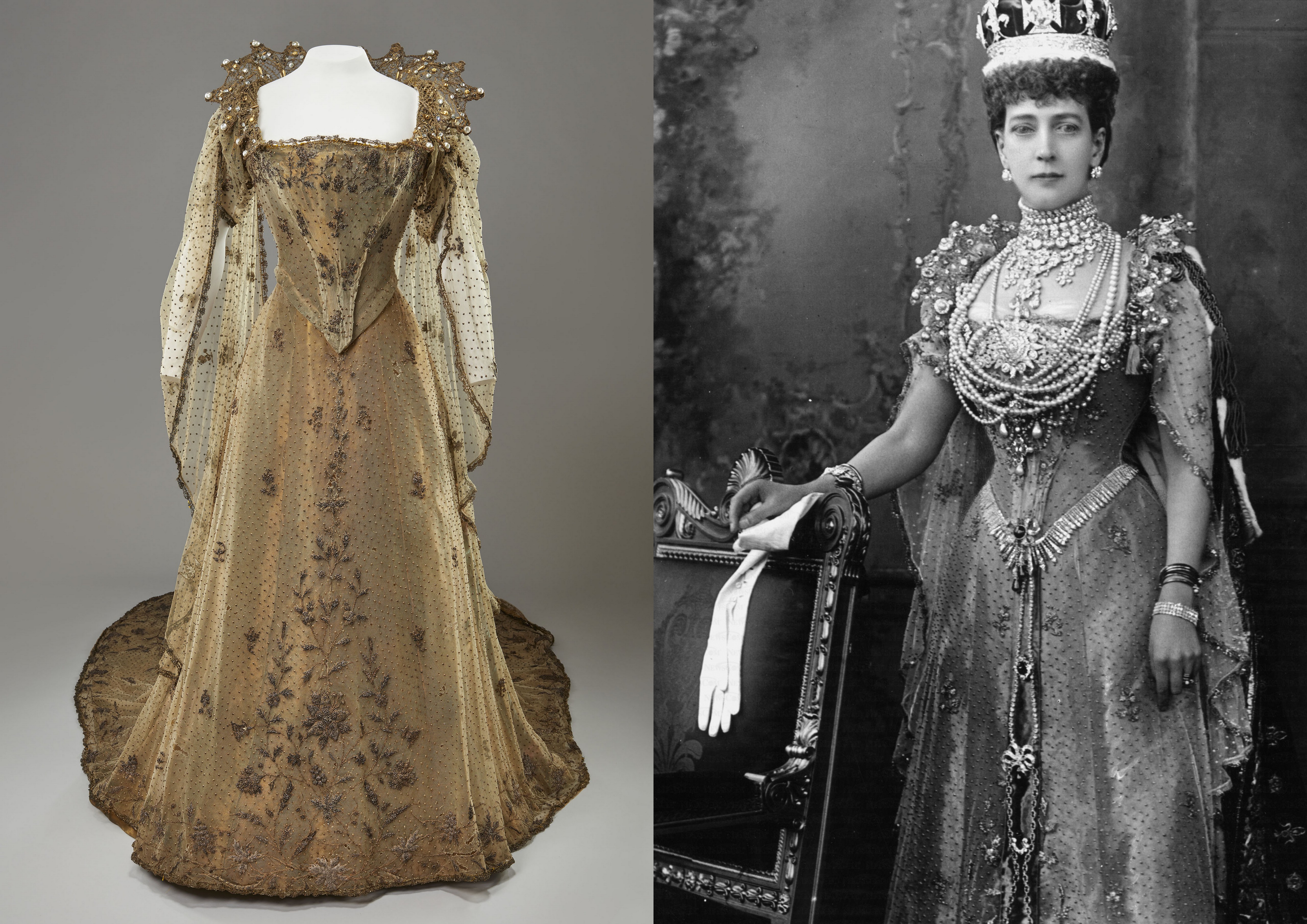 Após a morte da rainha Vitória, em 22 de janeiro de 1901, Edward e Alexandra ascenderam ao trono como novos rei e rainha consorte. A cerimônia de coroação, que marcaria com pompa o início do reinado do monarca, porém, só ocorreria mais de um ano depois. Para o evento, Alexandra decidiu romper com a tradição dos vestidos de coroação nos tons branco ou creme, inspirados em mantos eclesiásticos. Ela então optou pelo dourado, uma cor pouco usual. A confecção do traje foi mantida sob sigilo, para que seu design não vazasse antes da ocasião. Cada detalhe foi meticulosamente pensado pela rainha. Ela havia deixado instruções claras para que nenhum aspecto do vestido fosse “demasiadamente convencional”. A maior parte da peça foi feita em Delhi, pelas mãos de 41 costureiras, que trabalharam durante cinco meses consecutivos. A opção pela manufatura indiana reforçava, assim, as conexões imperialistas do Reino Unido com aquele país. Alexandra sugeriu que o bordado do vestido fosse aplicado sobre uma camada de tule dourado, com padrões que deveriam refletir a união dos reinos que compunham a Grã-Bretanha.