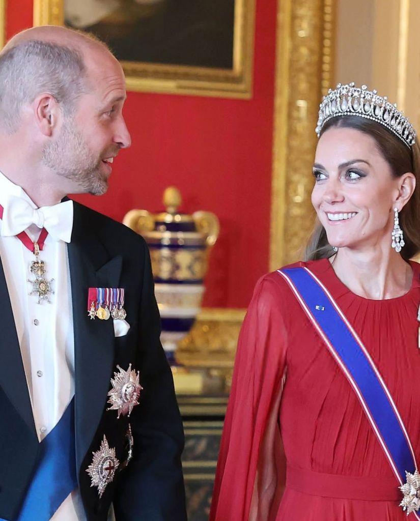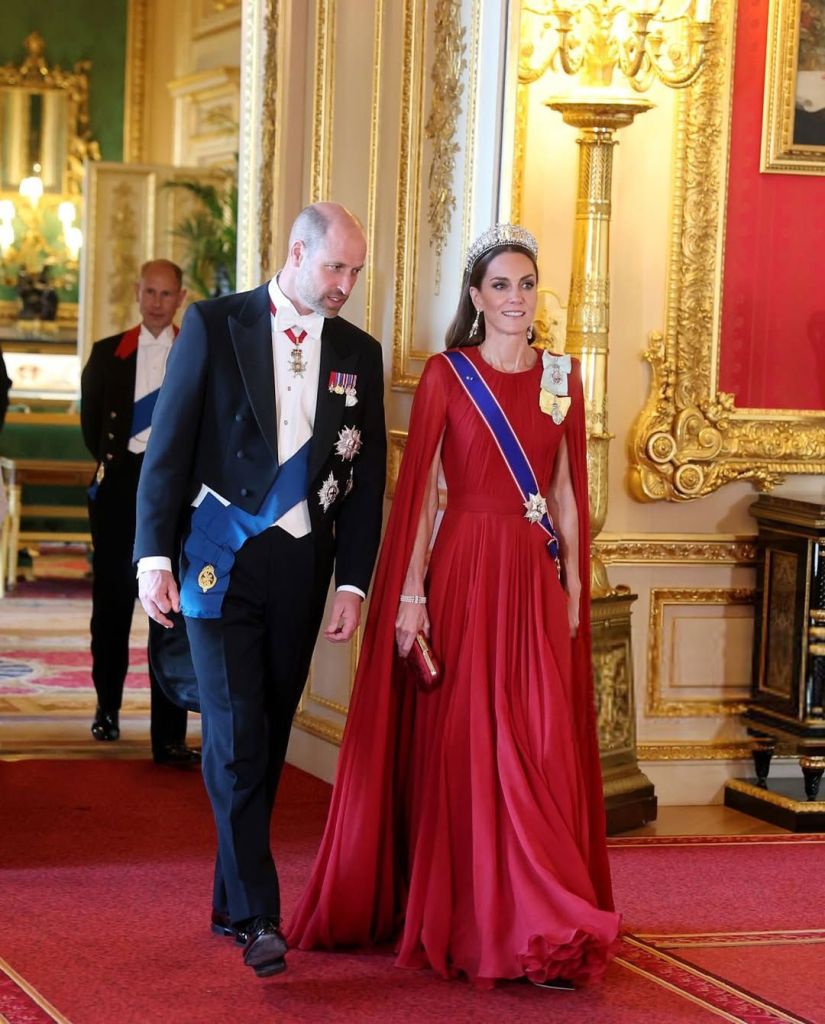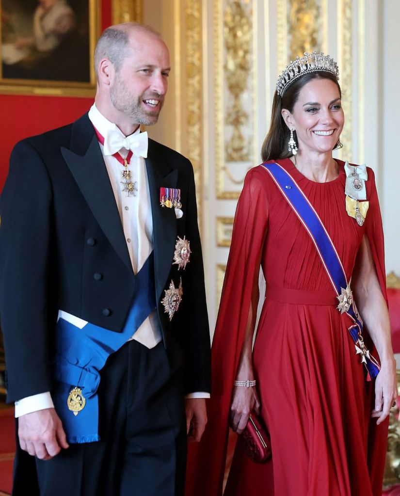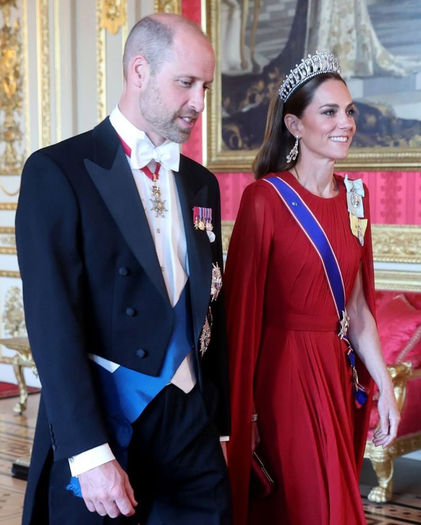 Com o divórcio do príncipe Charles, a tiara então ficou à disposição de outros membros da família real. Agora, é a nova princesa de Gales quem detém o usufruto da peça. Kate não era vista com essa joia há dois anos, desde o último banquete de Estado em que participou no Castelo de Windsor, no ano de 2023. Combinando com a tiara, ela tirou dos cofres reais o par de brincos de diamantes da finada rainha Elizabeth II. Na mão direita, a pulseira com três fios de pérolas de sua falecida sogra. A princesa cruzou o grande salão do castelo usando a faixa de Dama da Grande Cruz da Real Ordem Vitoriana e os laços com as Ordens de Elizabeth II e de Charles III. Outros membros da família real também se juntaram ao rei e à rainha na recepção, como a princesa Anne, o príncipe Edward, duque de Edimburgo e sua esposa, a duquesa Sophie. “Prontos para o que promete ser um maravilhoso banquete de Estado em Windsor”, escreveram o príncipe e a princesa de Gales nos seus perfis em redes sociais.