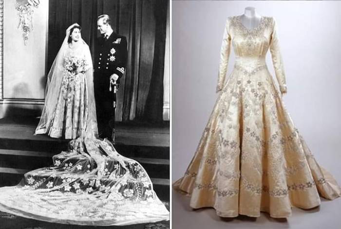 Fotografia da então princesa Elizabeth e de Philip, duque de Edimburgo, no dia de seu casamento, em 20 de novembro de 1947. Ao lado, o vestido usado pela rainha na cerimônia, desenhado por Sir Norman Hartnell. © Royal Collection Trust.