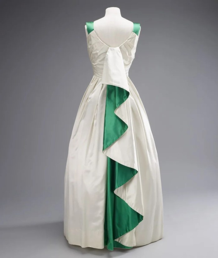 Vestido branco desenhado por Norman Hartnell para um banquete de Estado de 1961 em Karachi, que incorpora as cores nacionais do Paquistão por meio de uma dramática prega verde-esmeralda em cascata nas costas. © Royal Collection Trust.